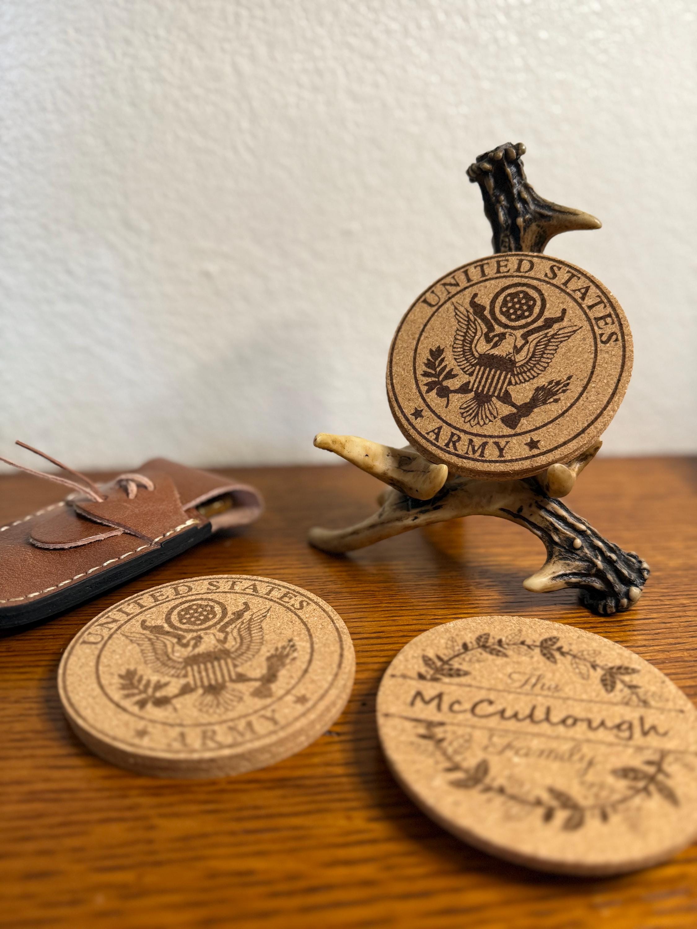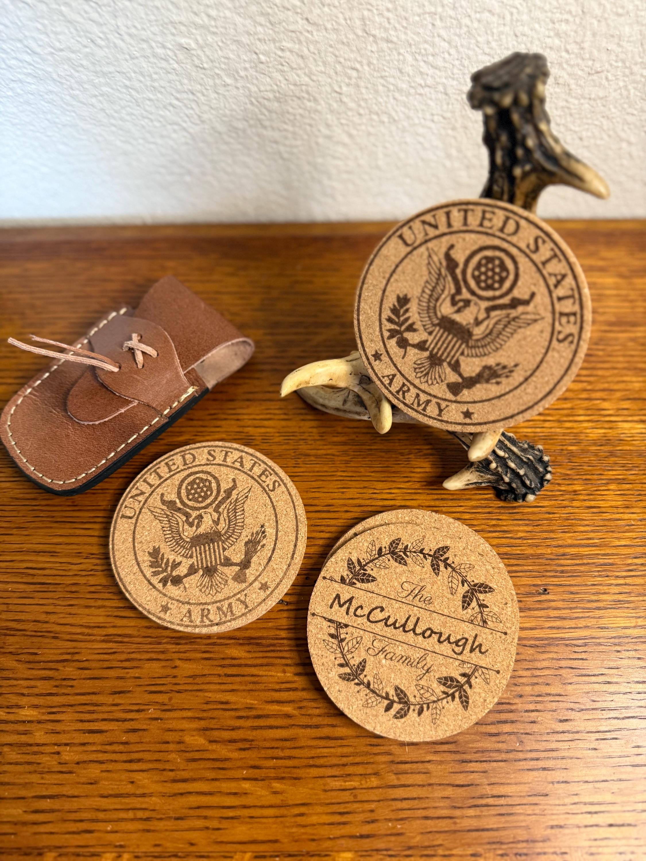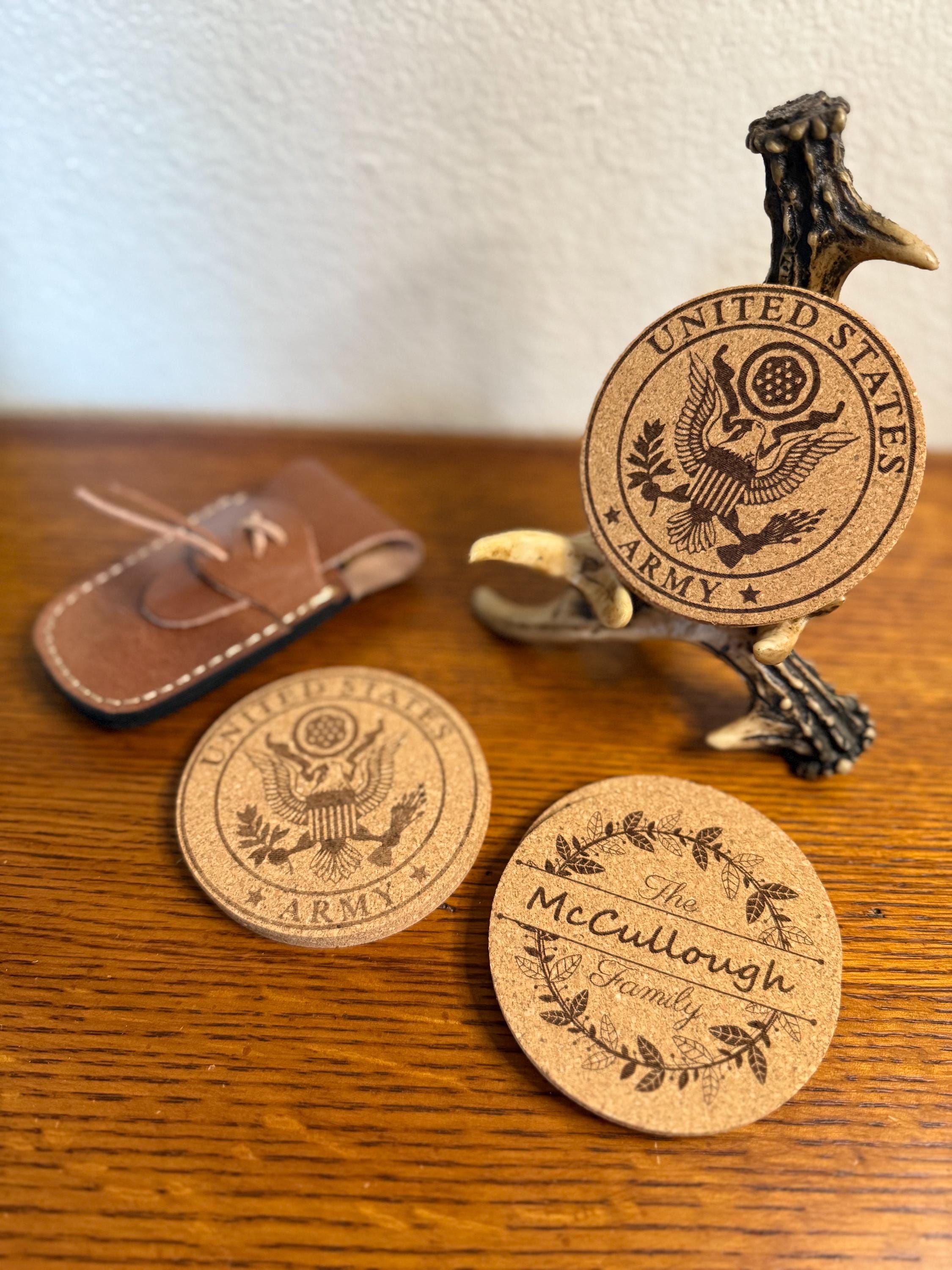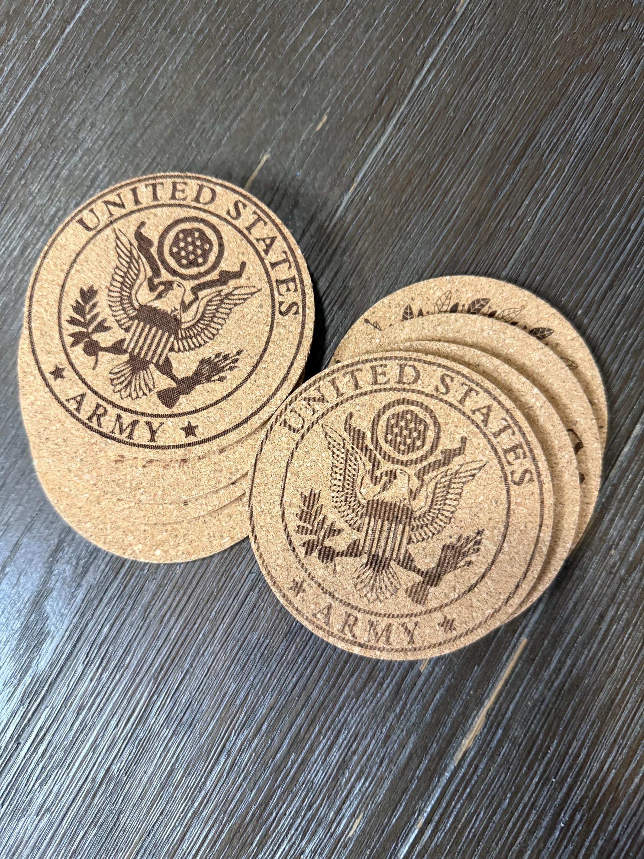 Add a touch of military pride to your home, bar, or office with this custom set of 4 engraved US military cork coasters. Each coaster features a detailed engraving of your chosen military branch logo, making them a perfect gift for active duty service members, veterans, and proud military families. Lightweight yet durable, cork naturally protects surfaces from moisture, scratches, and heat while adding a clean rustic look. These coasters make an excellent gift for military retirements, promotions, graduations, birthdays, or housewarming celebrations. A thoughtful and practical way to honor service while keeping your tables protected.