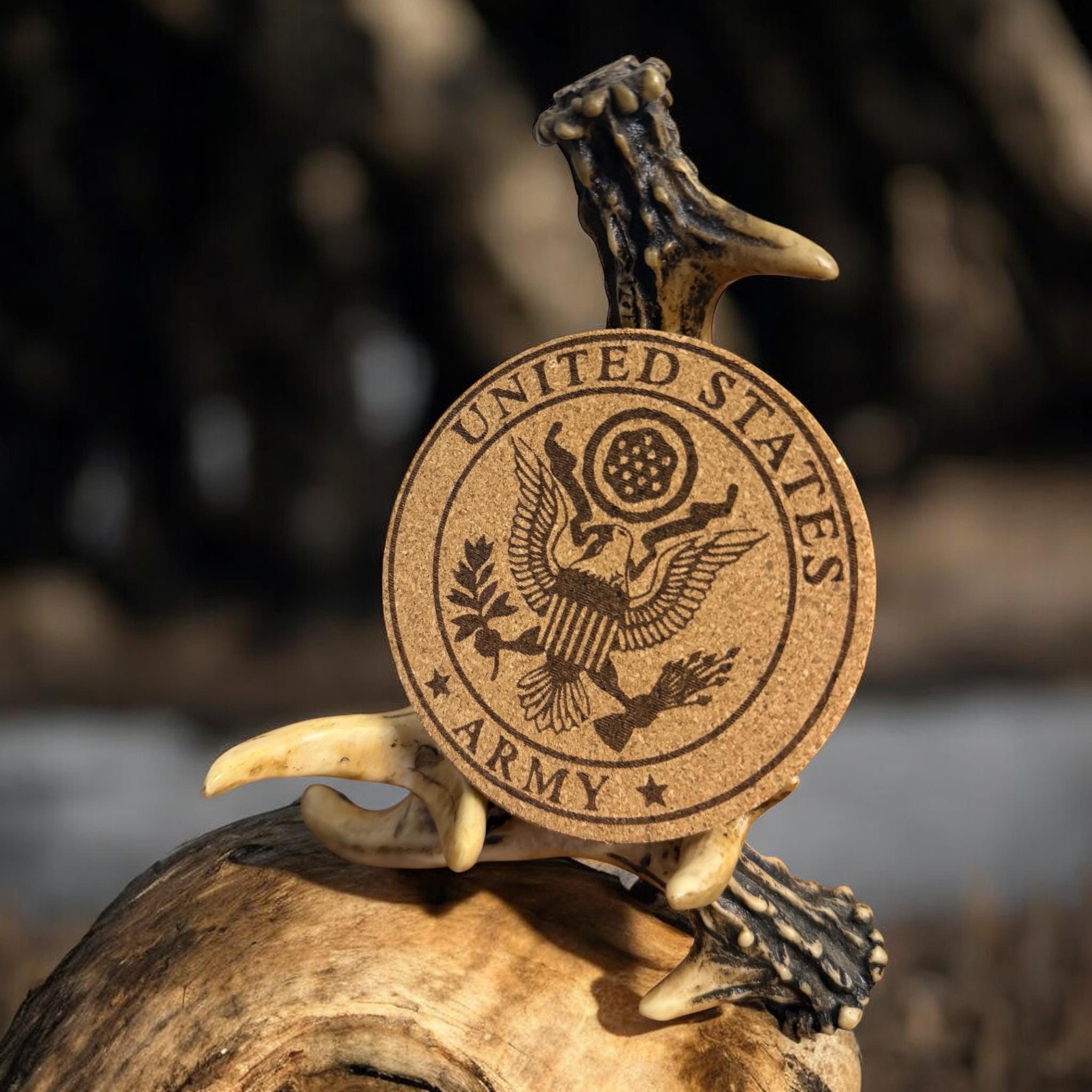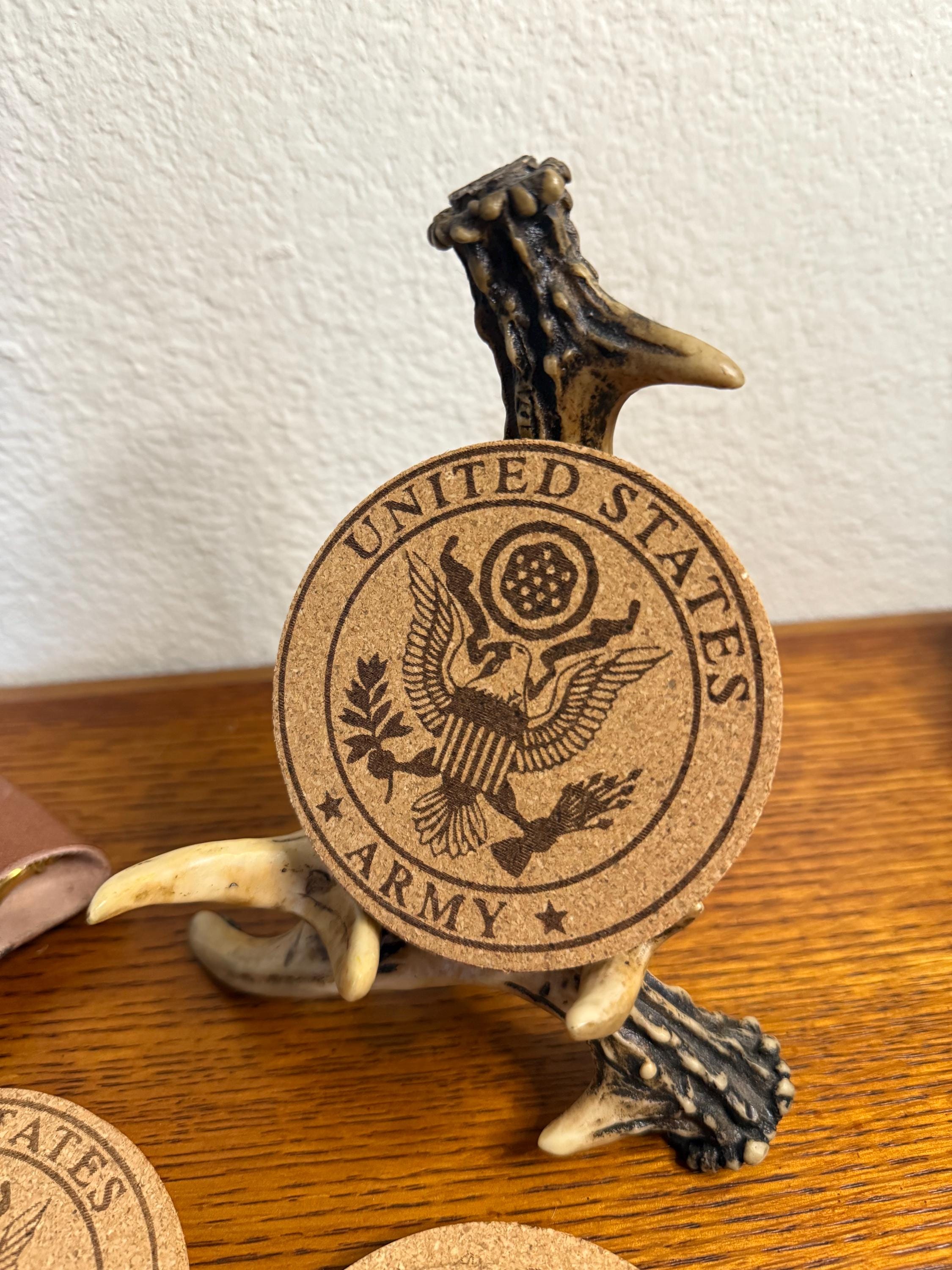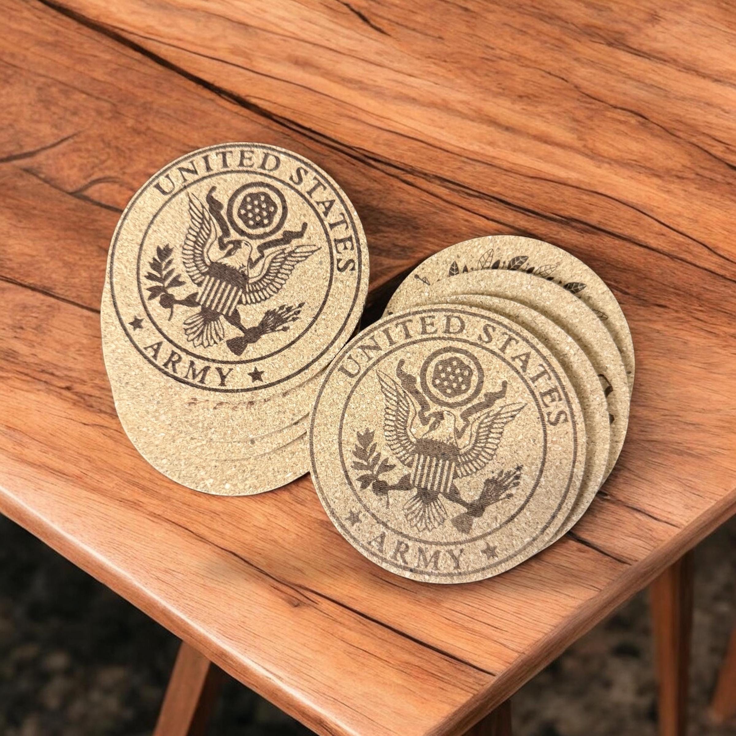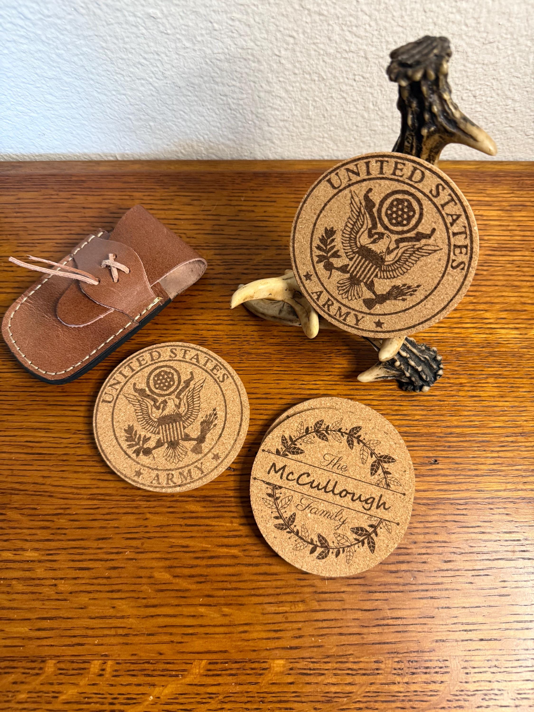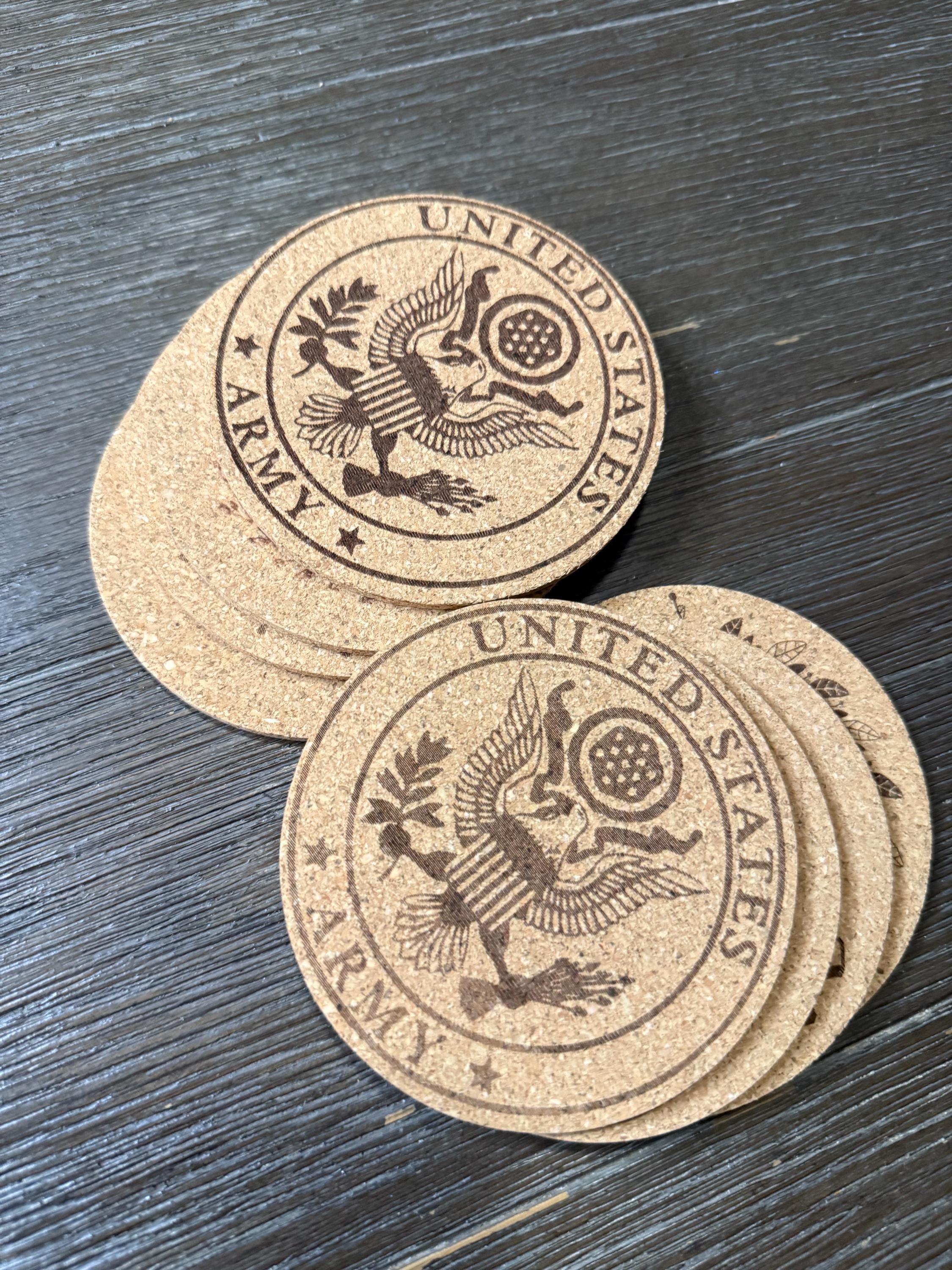 Add a touch of military pride to your home, bar, or office with this custom set of 4 engraved US military cork coasters. Each coaster features a detailed engraving of your chosen military branch logo, making them a perfect gift for active duty service members, veterans, and proud military families. Lightweight yet durable, cork naturally protects surfaces from moisture, scratches, and heat while adding a clean rustic look. These coasters make an excellent gift for military retirements, promotions, graduations, birthdays, or housewarming celebrations. A thoughtful and practical way to honor service while keeping your tables protected.
