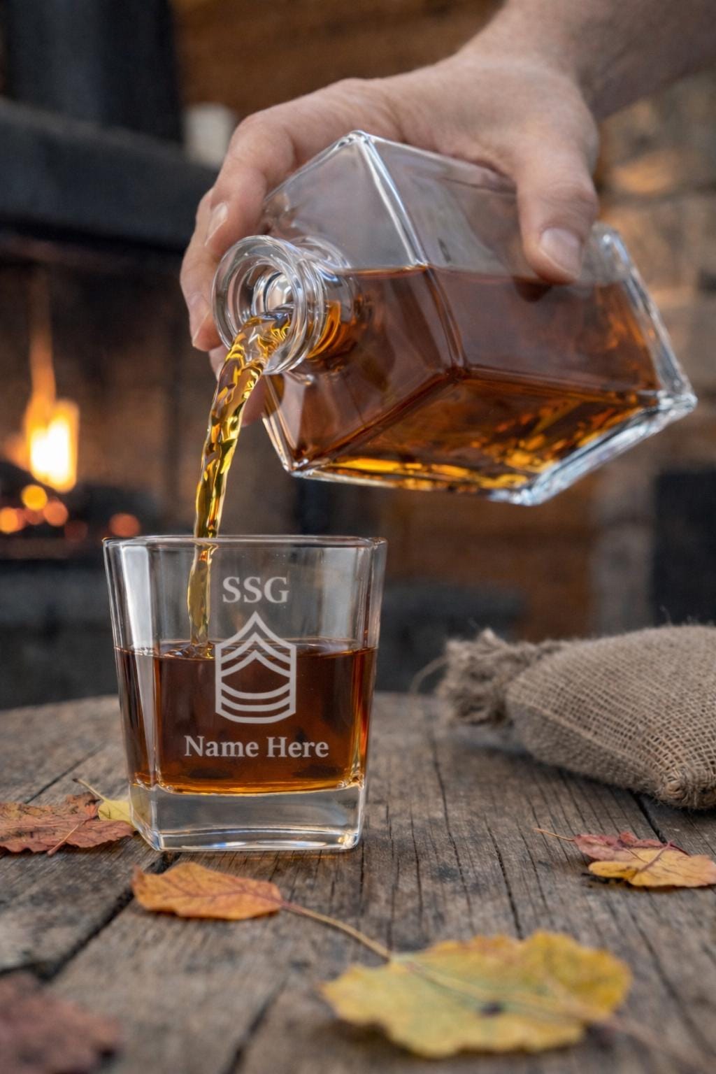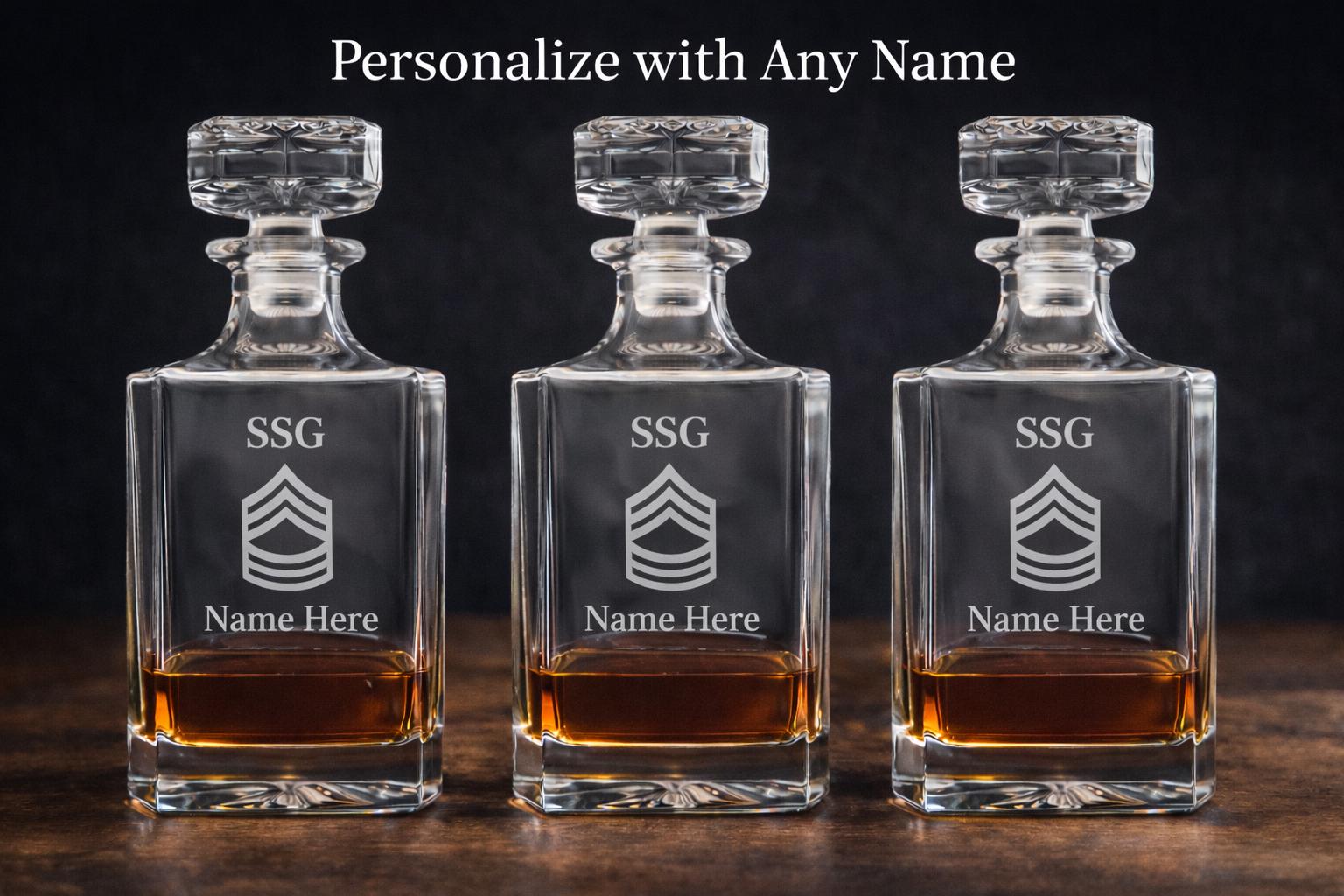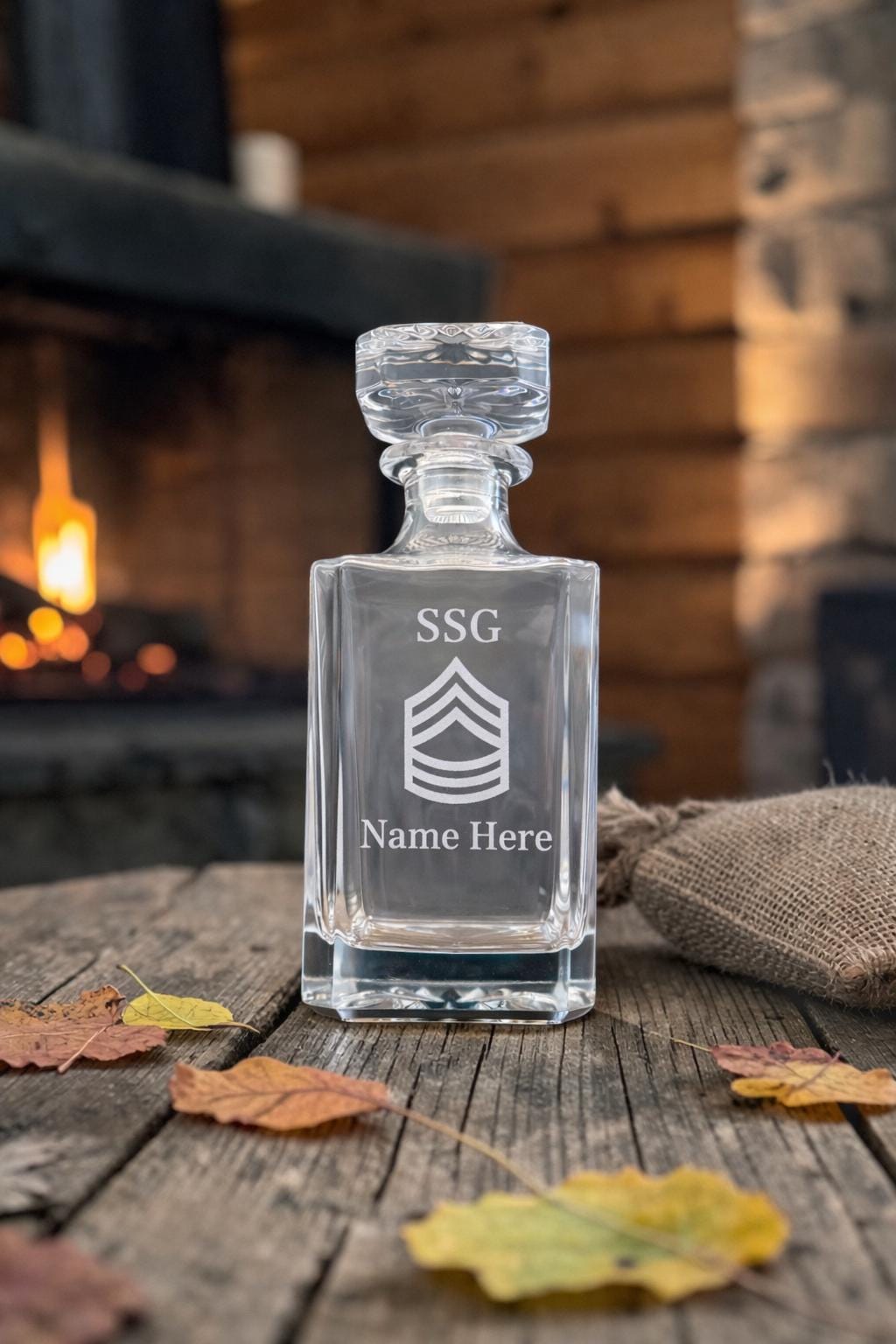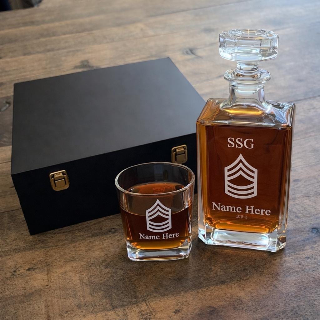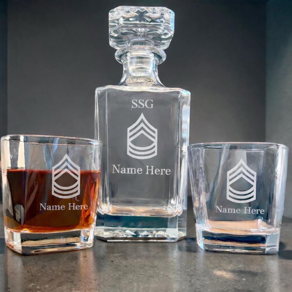 Celebrate leadership, dedication, and service with this custom engraved Army NCO whiskey decanter set. Each decanter is laser engraved with the Non-Commissioned Officer rank insignia and a personalized name, creating a meaningful gift for promotions, retirements, or honoring a soldier’s service.