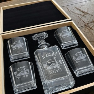 Set Includes • Engraved glass whiskey decanter • 4 Matching whiskey glasses • Wooden gift box