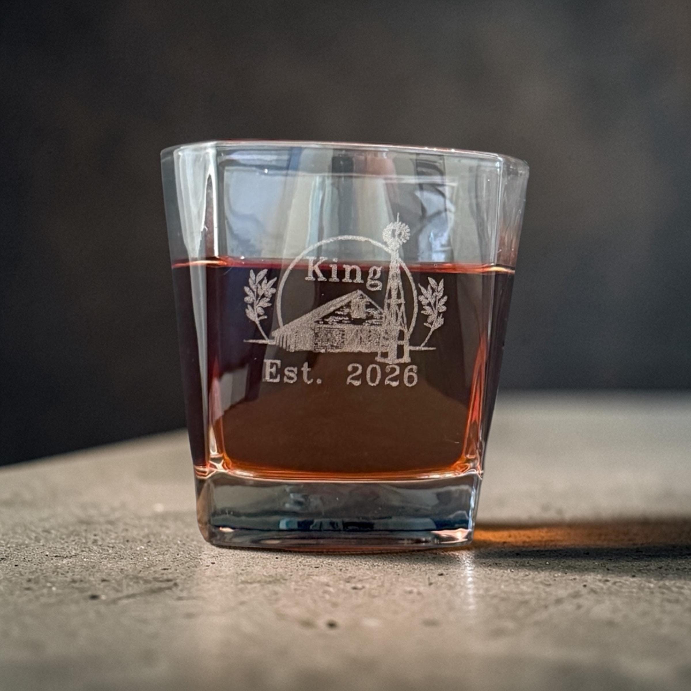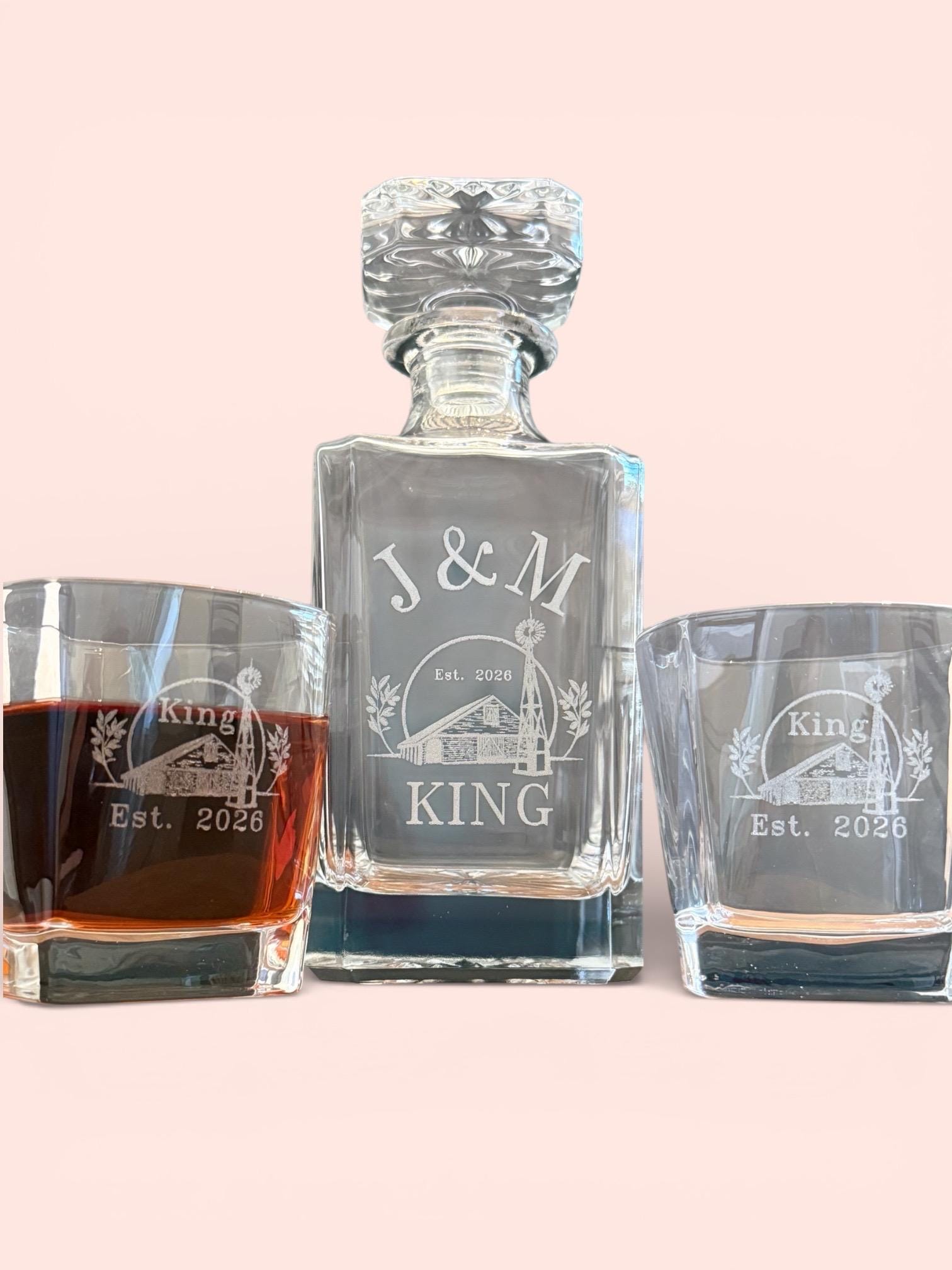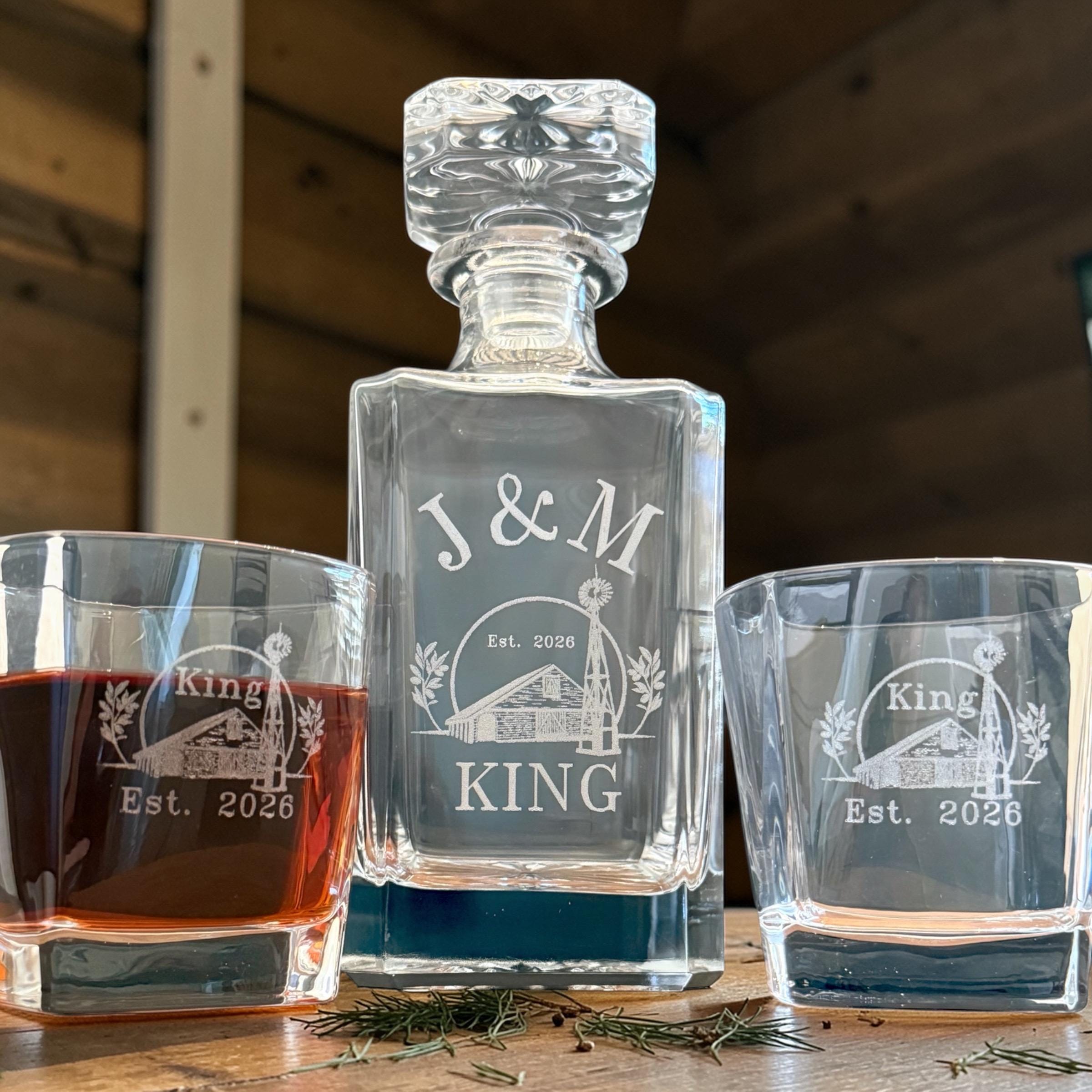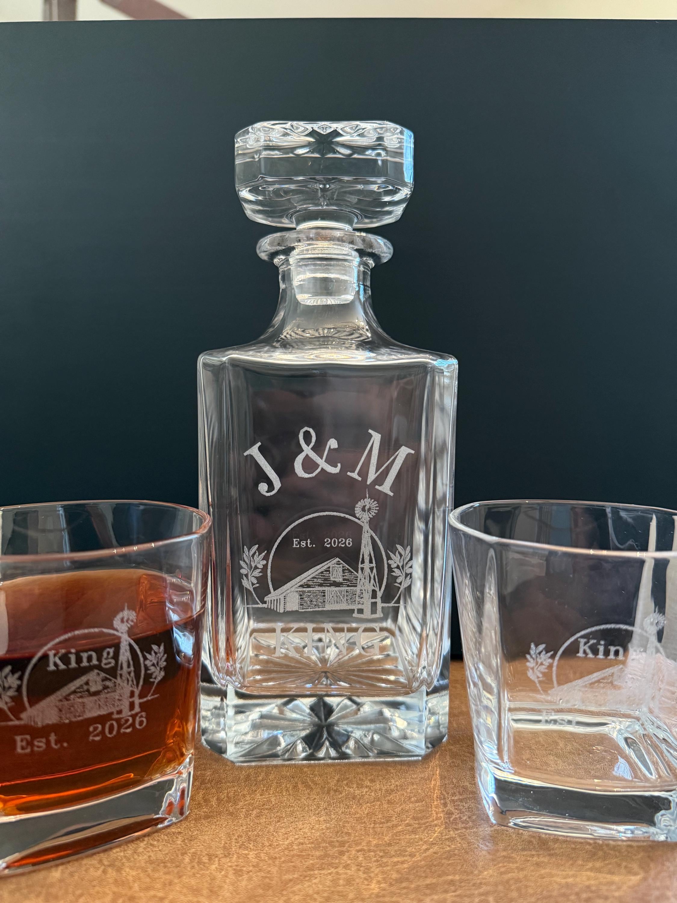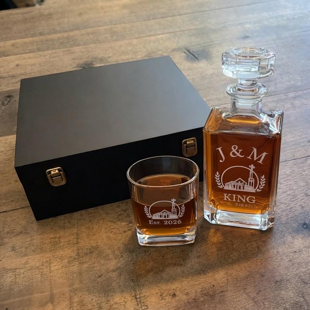 Set Includes • 1 engraved glass whiskey decanter • 4 engraved whiskey glasses • Custom laser engraving