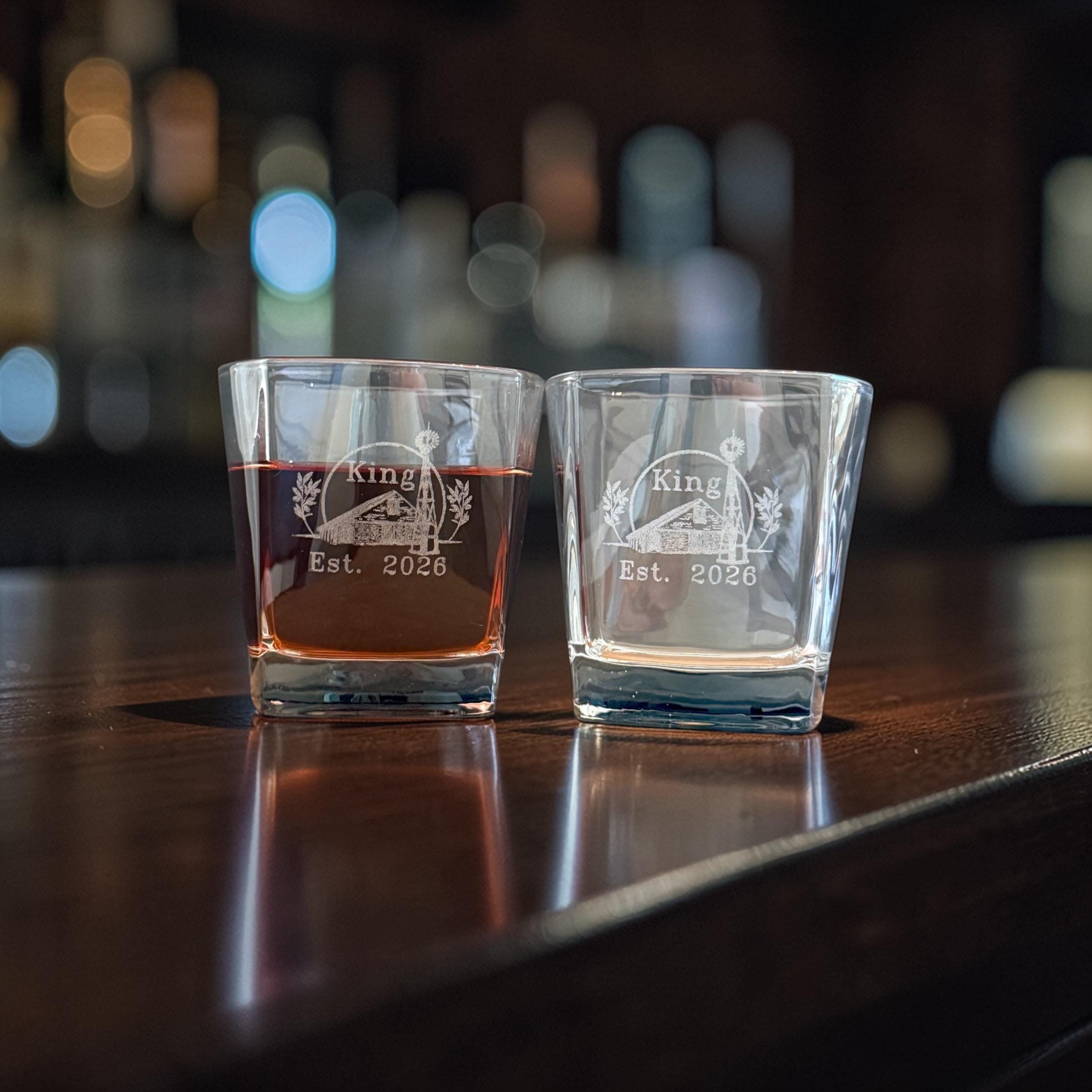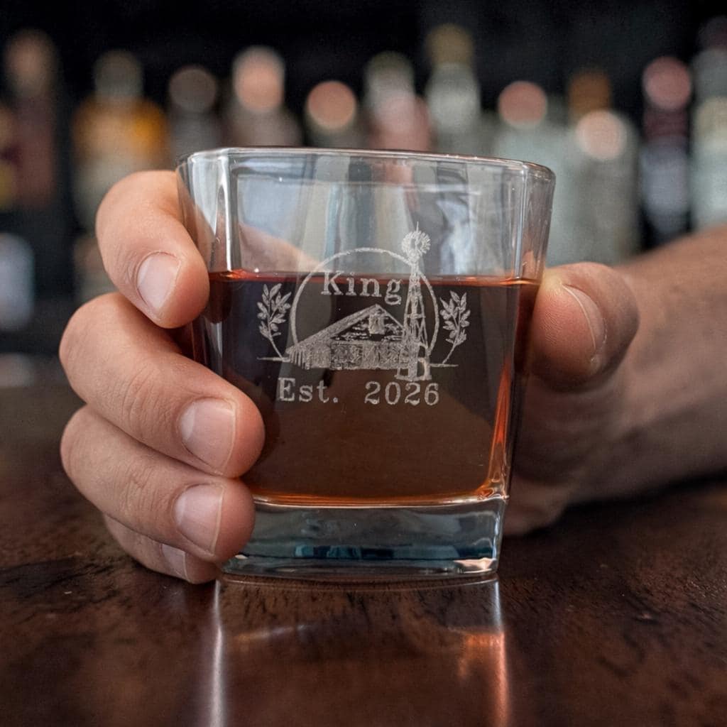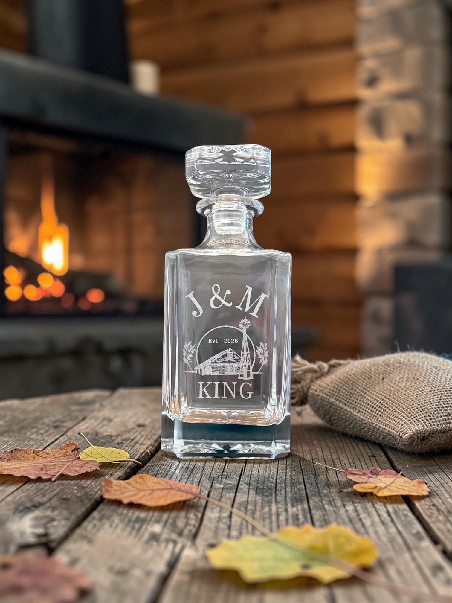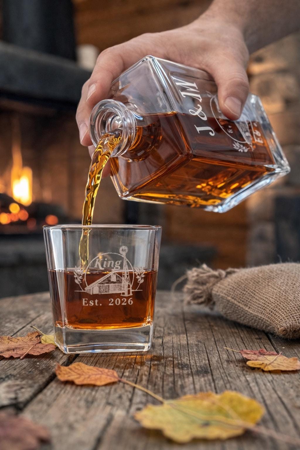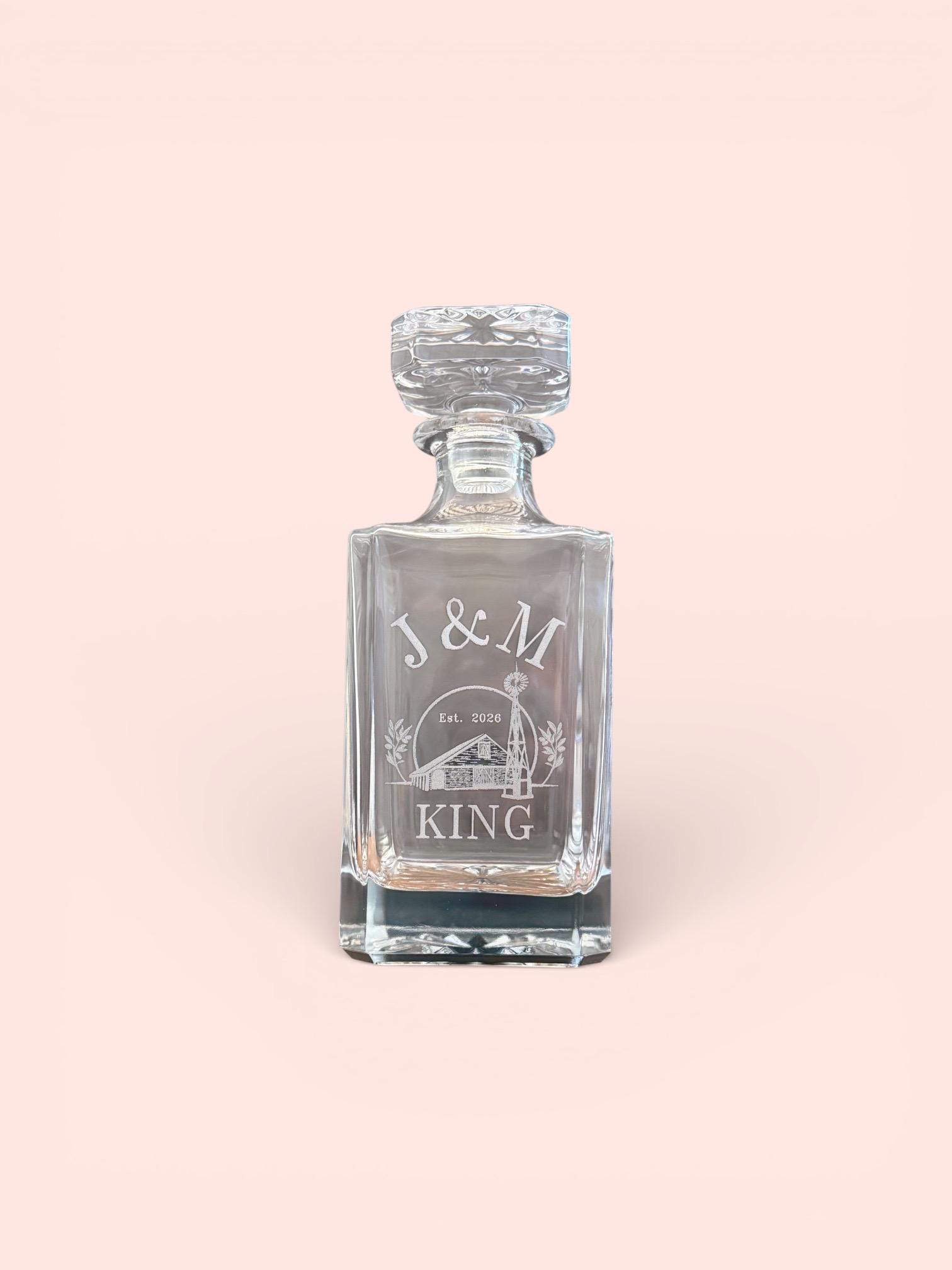 Upgrade your home bar or give a meaningful gift with this personalized whiskey decanter set with four matching glasses. Each piece is professionally laser engraved to create a timeless keepsake perfect for weddings, anniversaries, retirements, or Father’s Day.