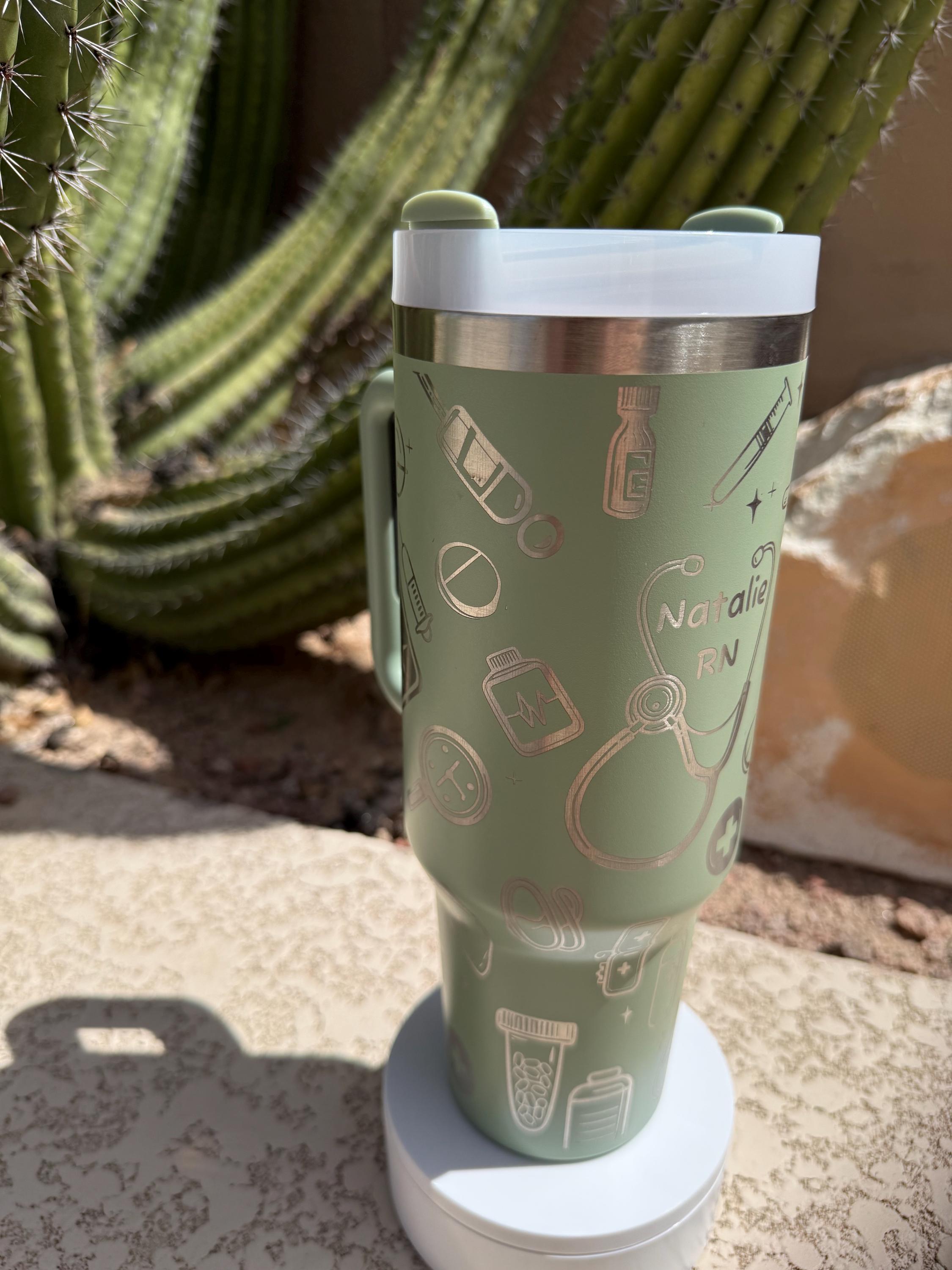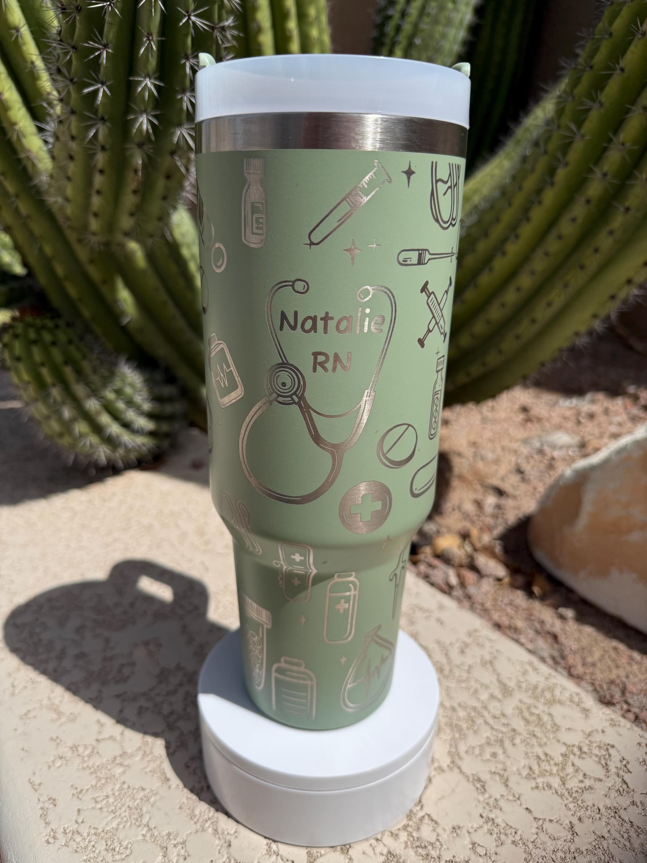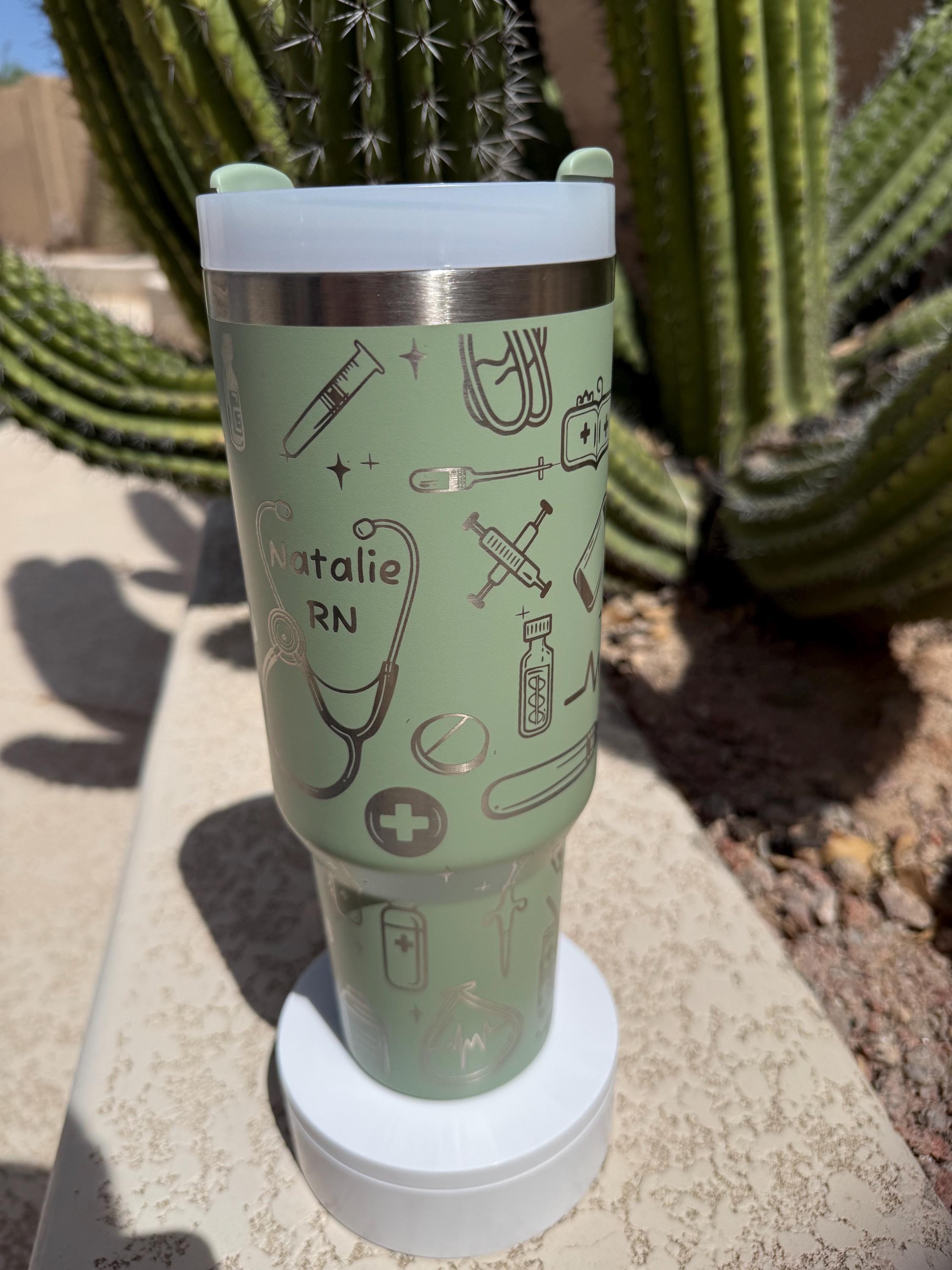Stay energized and show off your nursing pride with this stylish Laser Engraved Nurse Tumbler! Crafted for medical professionals like RN, LVN, and nurse students, this insulated travel mug combines functionality with a personalized touch. The sleek design features a charming nurse-themed illustration, including a stethoscope, syringe, and medical icons, beautifully engraved for a lasting impression.